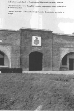 "A very memorable day for me ... boarded the express to Pecs arriving there at 11.15 hrs. After sorting out our language problems, we established that the best way to Szigitvar was by the train, so away we went, arriving there at 13.25 hrs. It certainly brought back some some memories for me! Nothing had changed much despite the fact that it is almost 32 years since I left there under heavy German guard, worried because I was in civilian clothes. The town is the same and the old sacred lion which I rode home New Years Eve (1943, I think) was still there and I was pleased to see the castle and the buildings were there, just as I remembered them. The castle of Andreas Mikailly (Miklos) is now a museum and well kept. We took some photographs, the lion, the room in the castle walls where we were locked up after the German occupation. We photographed the door in the hall where MacDonald and one other made a dash for it, but they were shot, also the roof where our Hungarian member tried to hide. I was glad we went, especially me."