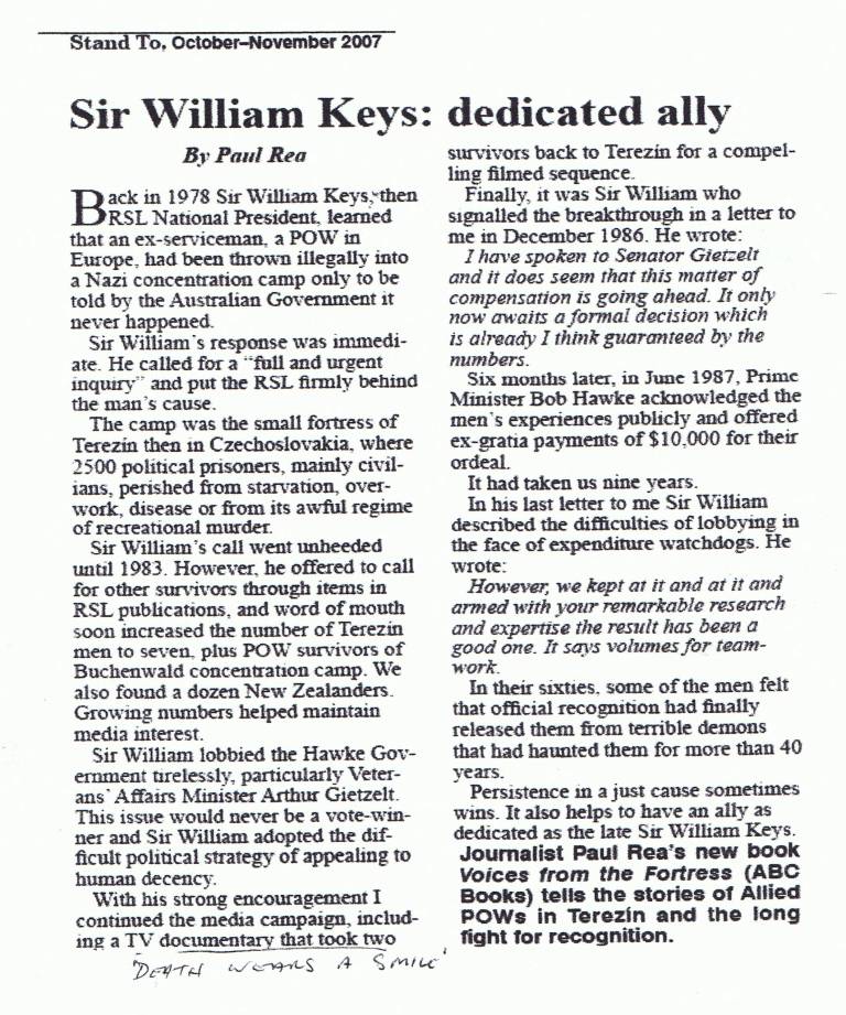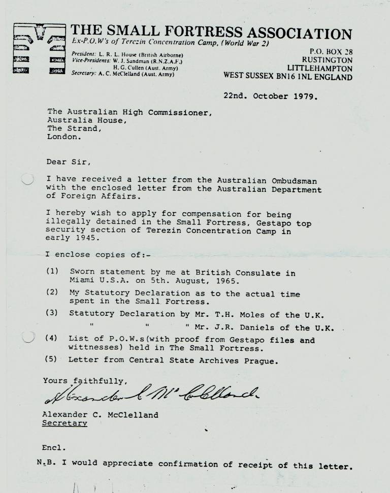 British claims, including those from Terezin, were settled in 1965. But when “The Small Fortress Association“ submitted similar claims for Anzac POW who had been immured at Terezin, both the Australian and New Zealand Governments continued to deny that any of their European POW had been sent to any Concentration Camps, while they maintained that a Concentration Camp at Terezin did not even exist, except in some POW minds.