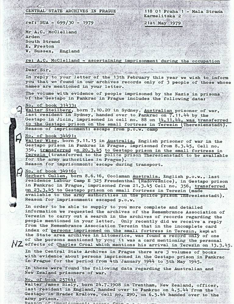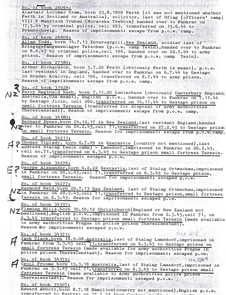 By that time, thanks to access to official Czech records held in the Central State Archives in Prague, “The Small Fortress Association” had quadrupled its contact list from the 3 Australians and 5 New Zealanders on its books in 1978 to 12 Australians and 17 New Zealanders in 1979. In the Prague archives, there were found to be 3 volumes of books with evidence about persons imprisoned in the Gestapo prison in Pankrac in Prague for the period from 4th January, 1944 to May 5th, 1945. There was never any doubt in the minds of Czechoslovakian authorities of the existence of The Small Fortress of Terezin, nor of the names of all the Allied POW sent there.