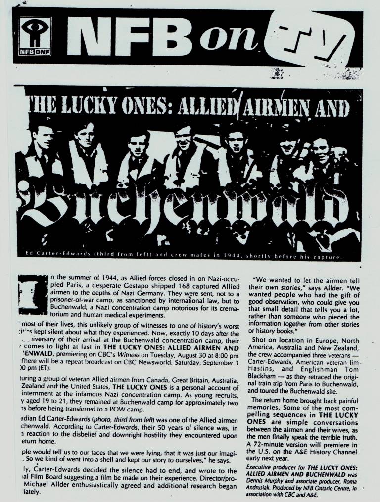 In August 1944, 164 Allied airmen from the civil prison of Fresnes in Paris, were transferred by train to the Concentration Camp of Buchenwald in Central Germany - 81 were from the USA, 47 from the UK, 29 from Canada, 9 from Australia and 2 from New Zealand (see D3). The Canadians have produced a documentary film - “The Lucky Ones” covering the Buchenwald incident.