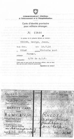 Two other firm mates - VX47656 Thomas Herbert Clive Davis and VX40994 Leslie Franklin Dower, who had been together in Campo 57 Gruppignano, then drafted out to work together at Campo 106 Vercelli, finally reached Switzerland together, after living behind the lines in Italy for ten months in the village of Chiaverano near Turin. Tom and Frank’s stay in Switzerland was short, arriving only two months before most AIF personnel were repatriated.