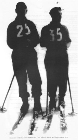 The 2/23rd Infantry Battalion had 22 “representatives” in Switzerland, including one officer VX40591 Lt B.B. "Barney" Grogan ex the "Moosburg Express". Two mates (VX35670 Norman Francis Molony and VX34562 Francis John Hayes) wasted no time getting into Switzerland, arriving a fortnight after the Italian Armistice was declared. (Norm Malony (No. 35) is shown in the picture at left competing in the slalom in Adelboden.)