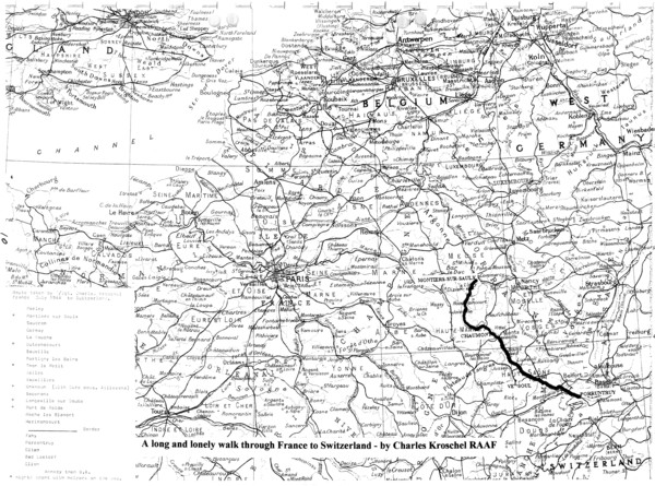 He was shot down twice. The first time over the English Channel where he was promptly fished out of the water and returned to base. And the second time over France where he wandered around until finally being guided to the Swiss border by members of the local resistance. He then had to reach that country's neutral territory by swimming an icy river, from which he was again fished out by a kindly Swiss, who provided him with warm civilian clothes. He was thus classified by the Swiss as an evader and was placed in the British airman's "camp" at Glion.